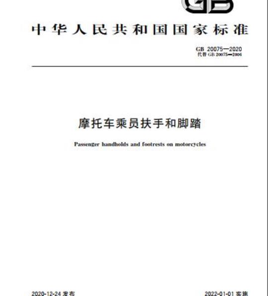 GB 20075规定了摩托车和轻便摩托车(以下简称“摩托车”)乘员扶手(拉带装置、手柄装置)和脚踏装置的技术要求及试验方法。