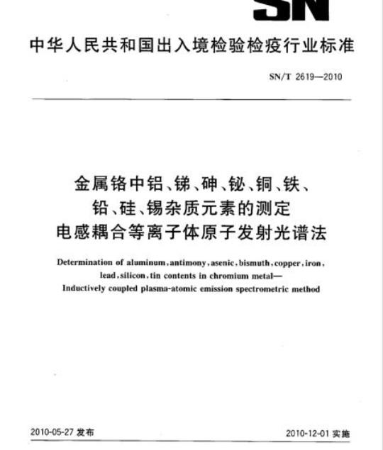 SN/T 2619规定了金属铬中铝、锦、砷、铋、铜、铁、铅、硅、锡杂质元素含量的电感耦合等离子体原子发射光谱(简称ICP-AES)测定方法。
