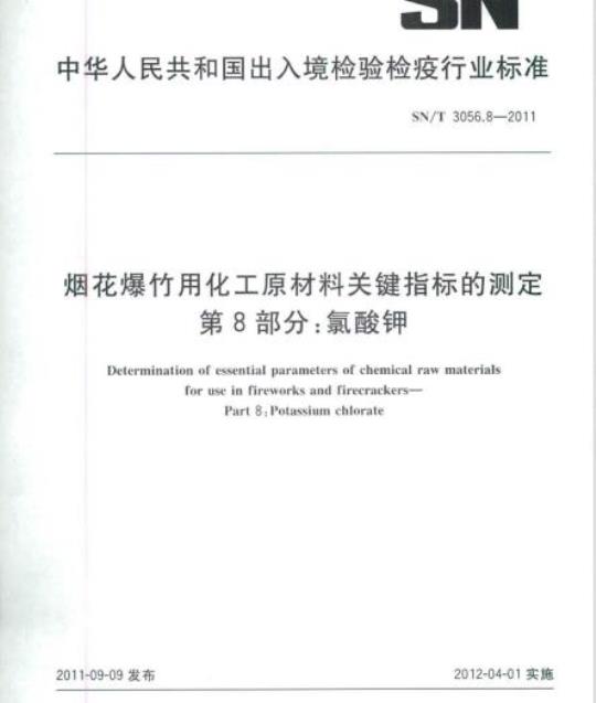 SN/T 3056.8规定了烟花爆竹用氯酸钾中氯酸钾纯度的测定方法、氯化物含量的测定方法、铁含量的测定方法、溴酸盐含量的测定、水不溶物含量的测定方法、水分含量的测定方法、pH值的测定方法吸湿率的测定方法、细度的测定方法。.