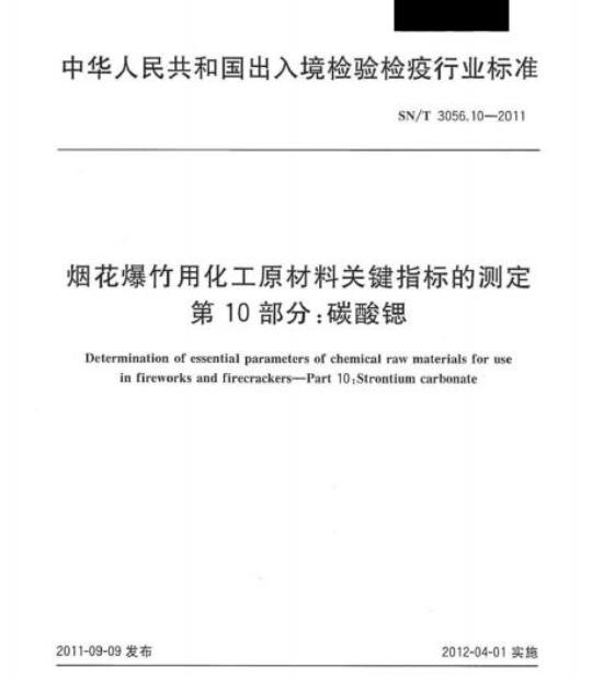 SN/T 3056.10规定了烟花爆竹用碳酸锶中锶含量的测定方法,钡含量(≤10%)的测定方法.钙含量的测定方法、盐酸不溶物的测定方法、水分的测定方法、铁含量的测定方法、吸湿率的测定方法、细度的测定方法。