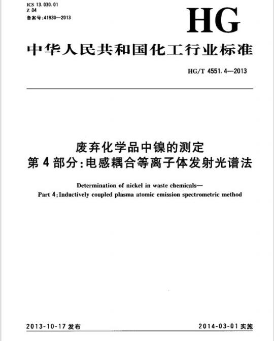 HG/T 4551.4规定了电感耦合等离子体发射光谱法测定废弃化学品中镍的原理.试剂和材料、仪器、祥品处理.分析步骤、结果计算。