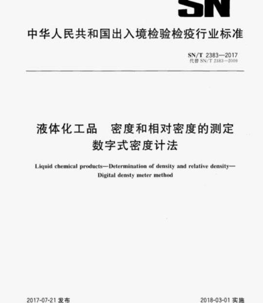SN/T 2383规定了使用数字式密度计测定液体化工品的密度和相对密度的测定方法。