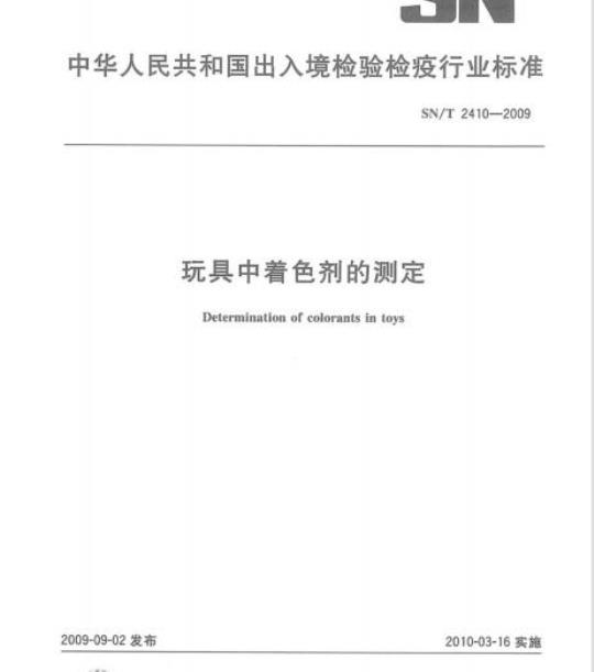 SN/T 2410规定了玩具中可接触液体以及纸质、木质、皮革、纺织品、带粘合剂的贴纸类、皮革、造型粘土及蜡笔等玩具中着色剂的液相色谱测定方法。