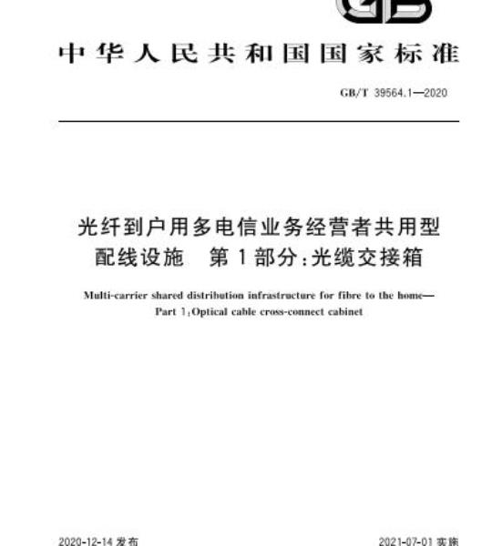 GB/T39564《光纤到户用多电信业务经营者共用型配线设施》分为以下三个部分:第1部分:光缆交接箱;