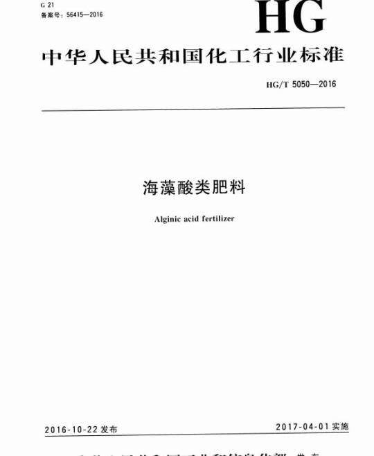 HG/T 5050适用于将以海藻为主要原料制备的海藻酸增效剂添加到肥料生产过程中制成的含有一定量海藻酸的海藻酸包膜尿素、含部分海藻酸包膜尿素的掺混肥料、海藻酸复合肥料、含海藻酸水溶肥料。