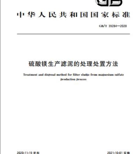 GB/T 39284规定了硫酸镁生产滤泥的组成、处理处置方法及环境保护要求。