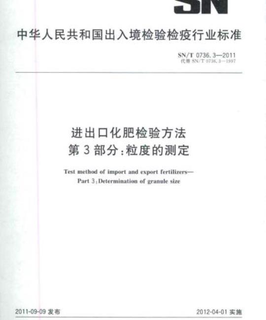 SN/T 0736.3适用于通过标称孔径在100 μm~5. 6 mm之间的固体化肥颗粒大小分布的测定。
