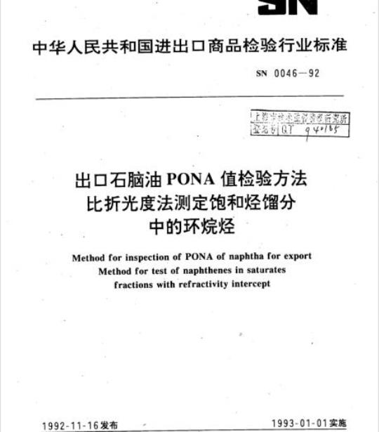 SN 0046-92.Method for inspection of PONA of naphtha for export Method for test of naphthenes in saturates fractions with refractivity intercept.