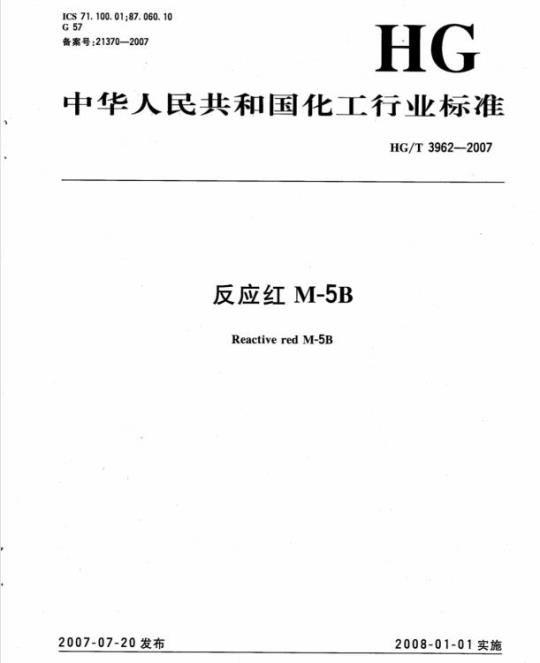 HG/T 3962适用于混拼染料反应红M-5B的质量检验。该产品主要用于棉、黏胶等纤维的染色。