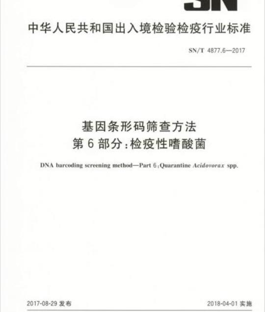SN/T 4877.6规定了Acidovorax citrulli、Acidovorax cattleyae 和Acidovorax konjaci 三种检疫性嗜酸菌的DNA条形码筛查中序列的扩增、分析及结果判定等。