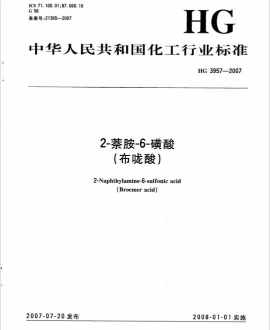 HG 3957适用于2-萘胺-6-磺酸的产品质量检验,该产品主要用于制造酸性.直接和媒染偶氮染料等。