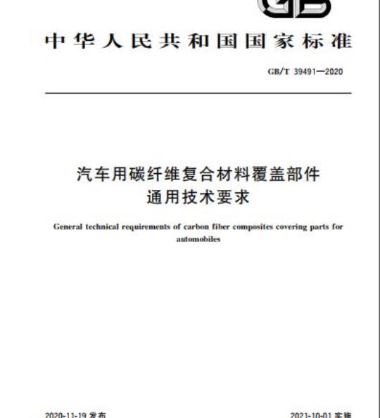 GB/T 39491规定了汽车用碳纤维复合材料覆盖部件的材料、工艺、要求、试验方法、检验规则、标志、包装、运输和贮存。