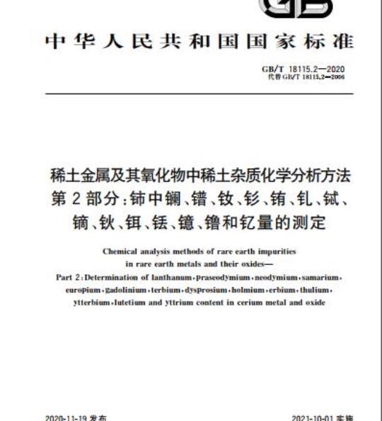GB/T 18115.2适用于氧化铈中氧化镧、氧化镨、氧化钕、氧化钐、氧化铕、氧化钆、氧化铽、氧化镝、氧化钬、氧化铒、氧化铥、氧化镱、氧化镥和氧化钇含量的测定。