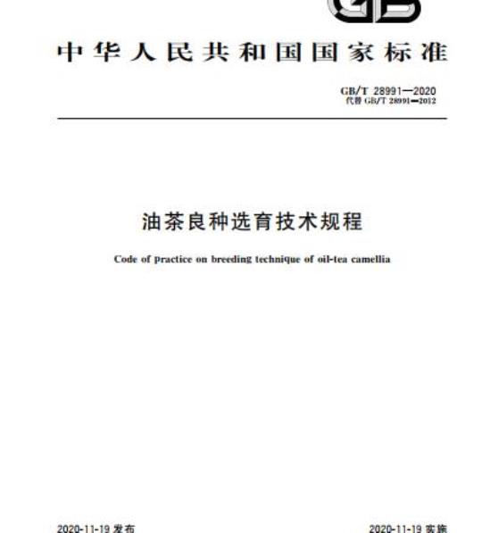 GB/T 28991规定了油茶良种选育的优树选择、人工杂交、试验测定、区域试验等技术规程。