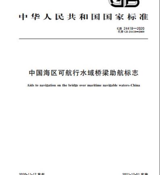 GB 24418规定了中国海区可航行水域桥梁助航标志的种类、功能、形状、尺寸、颜色、灯质、设置和命名.规则。