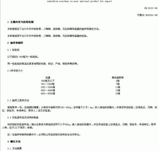 SN 0123规定了出口牛肉中敌敌畏、二嗪磷、倍硫磷、马拉硫磷残留量的抽样和测定方法。