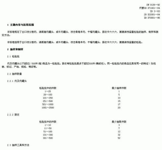 SN 0126规定了出口冻分割肉、清蒸猪肉罐头、咸牛肉罐头、冻去骨卷羊肉、午餐肉罐头、肠衣中六六六、滴滴涕残留量检验的抽样、制样和测定方法。