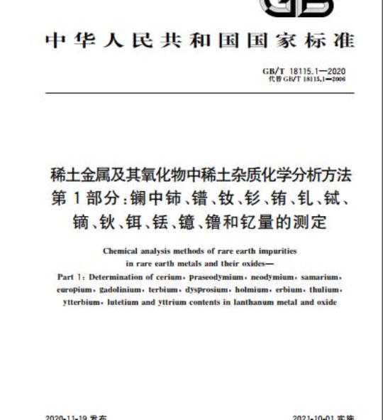 GB/T 18115.1适用于氧化镧中氧化铈、氧化镨、氧化钕、氧化钐、氧化铕、氧化钆、氧化铽、氧化镝、氧化钬、氧化铒、氧化铥、氧化镱、氧化镥和氧化钇含量的测定。