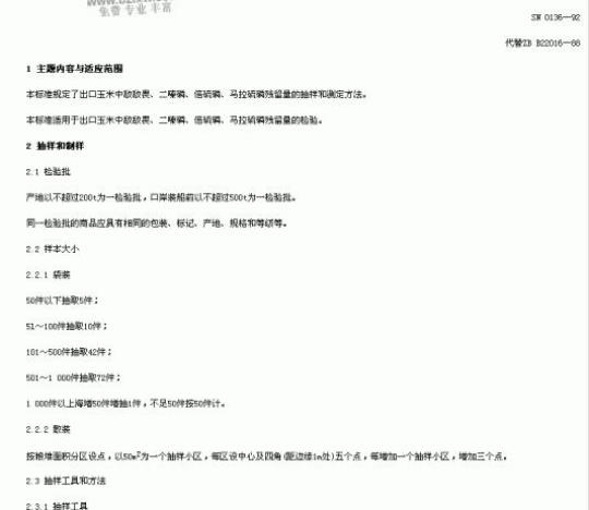 SN 0136规定了出口玉米中敌敌畏、二嗪磷、倍硫磷、马拉硫磷残留量的抽样和测定方法。