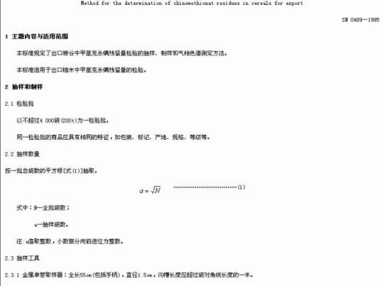 SN 0489规定了出口粮谷中甲基克杀螨残留量检验的抽样、制样和气相色诸测定方法。