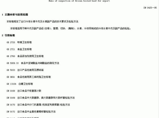 SN 0425适用于鲜牛肉及副产品经(法骨)、整理、切块、(腌制)、 水煮、冷冻而制成的冷冻水煮牛肉及副产品的检验。