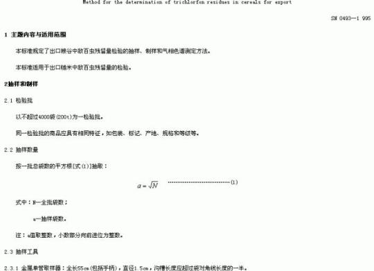 SN 0493规定了出口粮谷中敌百虫残留量检验的抽样、制样和气相色诸测定方法。