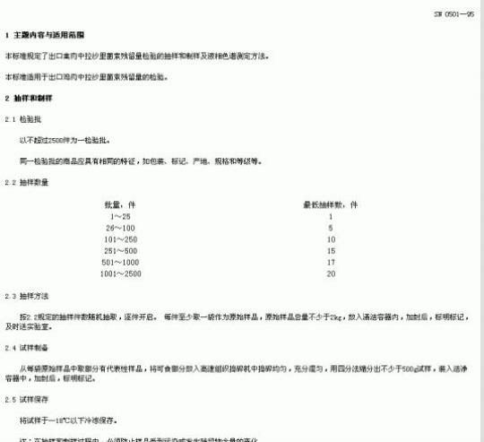 SN 0501规定了出口禽肉中拉杪里菌索残留量检验的抽样和制样及液相色谱测定方法。
