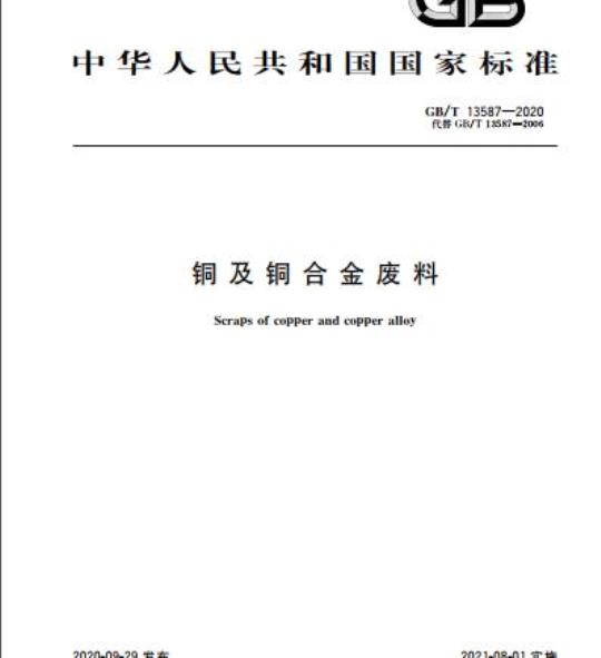 GB/T 13587规定了铜及铜合金废料(以下简称铜废料)的分类、技术要求、试验方法、检验规则、标志、包装、运输、贮存和订货单(或合同)内容等。