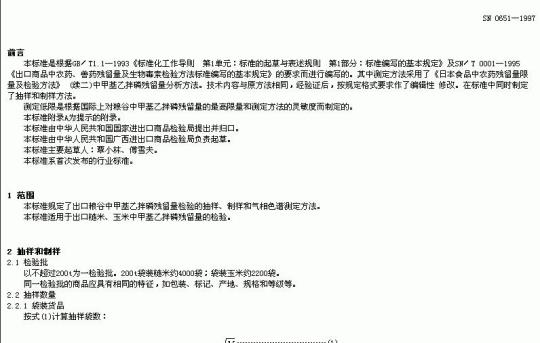 SN 0651规定了出口粮谷中甲基乙拌磷残留量检验的抽样、制样和气相色谱测定方法。