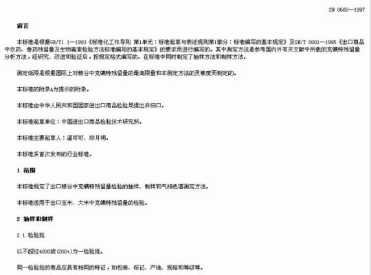 SN 0660规定了出口粮谷中克螨特残留量检验的抽样、制样和气相色谱测定方法。