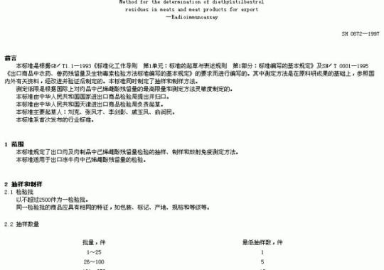 SN 0672规定了出口肉及肉制品中己烯雌酚残留量检验的抽样、制样和放射免疫测定方法。