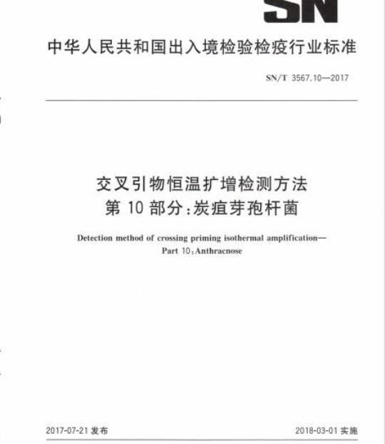 SN/T 3567.10规定了国境口岸炭疽芽孢杆菌交叉引物恒温扩增法检测的对象、检测程序及检测结果的报告。