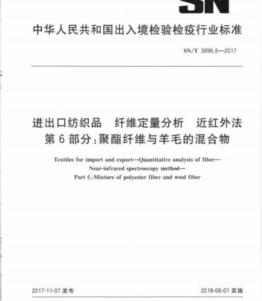 SN/T 3896.6规定了近红外光谱法快速测定聚酯纤维与羊毛混合物的纤维含量的方法。