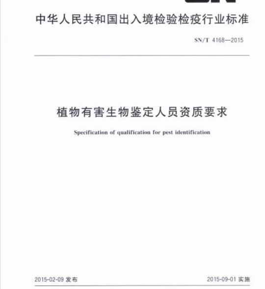 SN/T 4168规定了出入境检验检疫机构植物检疫工作中植物有害生物鉴定人和鉴定专家的资质要求。
