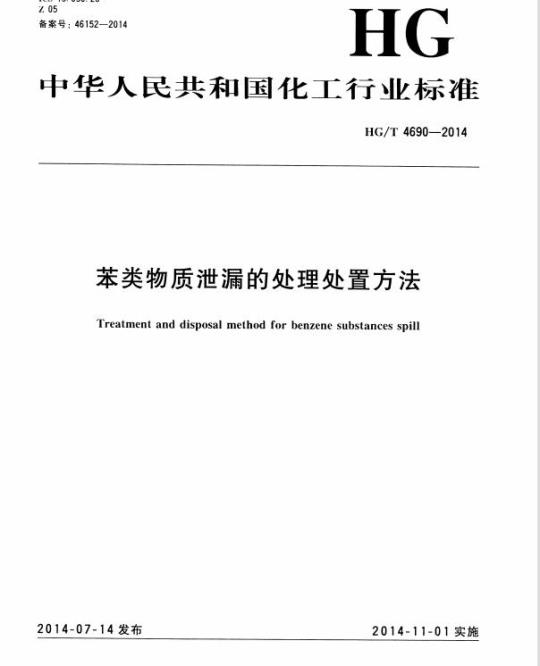 HG/T 4690告知了苯类物质的理化性质和危害性,规定了苯类物质泄漏时的紧急措施、泄漏现场环境监控、泄漏现场处理方法、泄漏物处置方法。