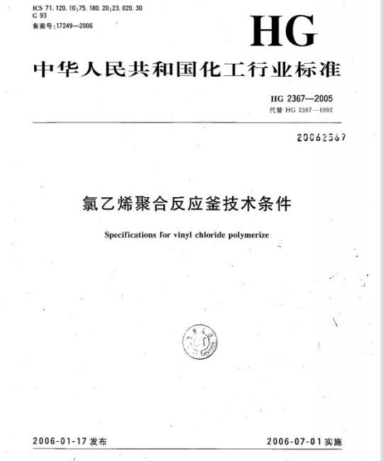 HG 2367规定了氯乙烯聚合反应釜(以下简称聚合釜)设计、制造、检验及验收的要求。