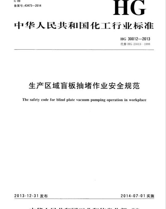 HG 30012-2013.The safety code for blind plate vacuum pumping operation in workplace.