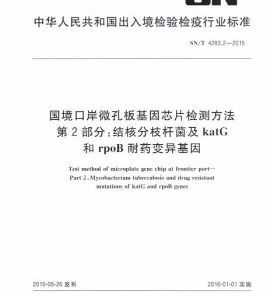 SN/T 4283.2规定了国境口岸结核分枝杆菌及katG和rpoB耐药变异基因的微孔板基因芯片检测方法。