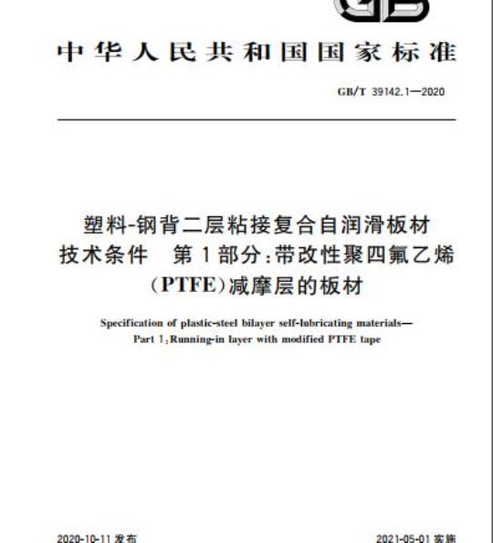 GB/T 39142的本部分规定了表面塑料层为改性聚四氟乙烯的塑料-钢背二层粘接复合自润滑板材的材料结构特点、技术要求和试验方法。
