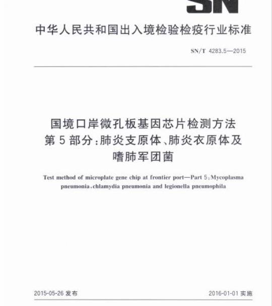 SN/T 4283.5规定了国境口岸3种非典型肺炎病原体(肺炎支原体、肺炎衣原体及嗜肺军团菌)的微孔板基因芯片检测方法。