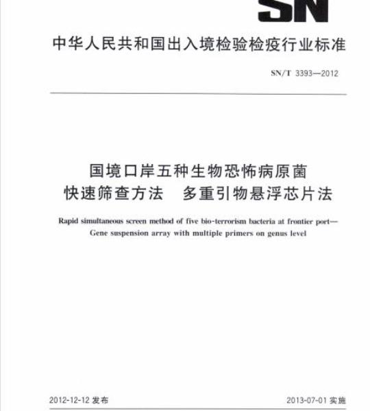 SN/T 3393适用于国境口岸可疑粉末状样品中炭疽芽胞杆菌、鼠疫耶尔森菌.布鲁菌、土拉弗朗西斯菌和类鼻疽伯克霍尔德菌五种重要生物恐怖相关细菌的多重检测。