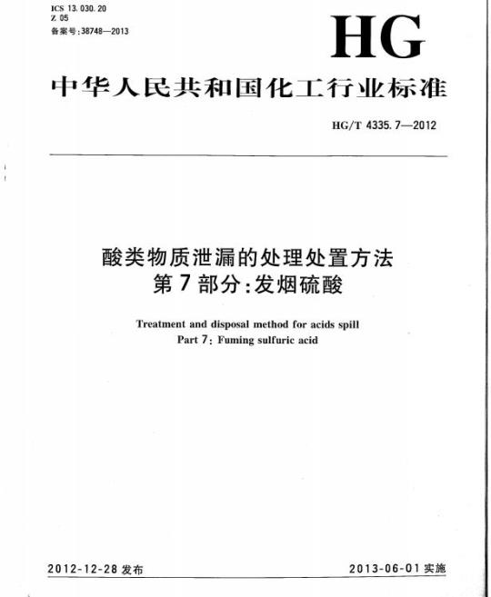 HG/T 4335.7适用于发烟硫酸在生产、贮存、使用、经营和运输等过程中发生泄漏时的处理、处置。