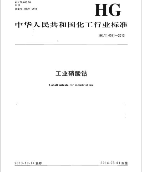 HG/T 4521适用于工业硝酸钴。工业硝酸钴主要用作生产其它钴盐的原料,陶瓷工业中用作着色剂,油墨涂料、油漆催干剂、氰化物中毒的解毒剂,还可制造环烷酸钴、含钴催化剂等。
