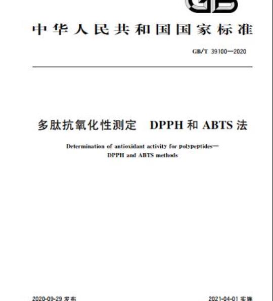 GB/T 39100规定了DPPH和ABTS法测定多肽抗氧化性能的方法。
