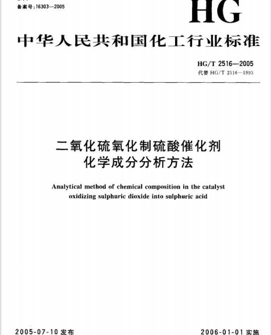 HG/T 2516-2005.Analytical method of chemical composition in the catalyst oxidizing sulphuric dioxide into sulphuric acid.
