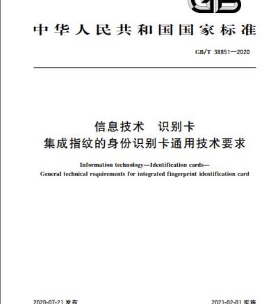 GB/T 38851规定了集成指纹的身份识别卡(以下简称指纹身份识别卡)的基本组成、外观与结构、机械适应性、环境适应性、电特性与传输协议、通用流程与基本功能性能、命令、信息安全等要求。