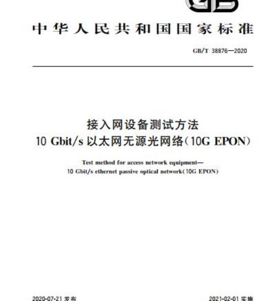 GB/T 38876规定了10 Gbit/s以太网无源光网络(10G EPON)局端设备(OLT)和用户侧设备(ONU)的接口、功能、性能、网管等方面的测试方法。