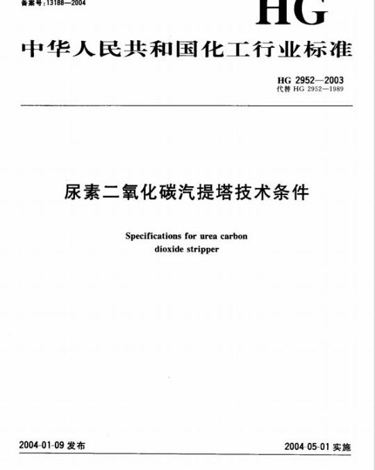 中文名称:代替 HG 2952-1989 尿素二氧化碳汽提塔技术条件