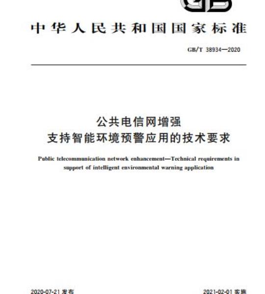 GB/T 38934-2020.Public telecommunication network enhancement-Technical requirements in support of intelligent environmental warning application.