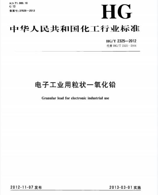 HG/T 2325适用于电子工业用粒状一氧化铅。主要用于制造玻壳和铅玻璃等原料。